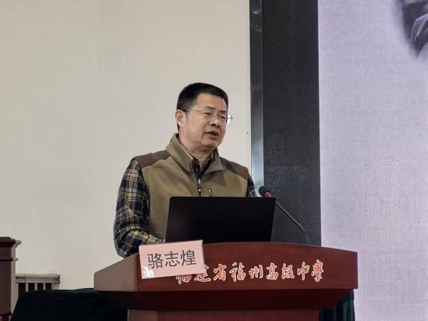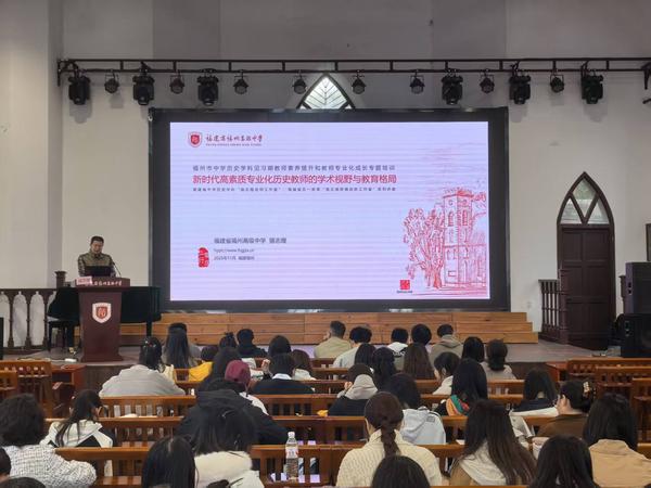 校園參觀結(jié)束后,福州高級中學(xué)黨委書記、二級正高級教師、特級教師,福建省中學(xué)歷史學(xué)科“駱志煌名師工作室”領(lǐng)銜名師駱志煌,作題為《新時代高素質(zhì)專業(yè)化歷史教師的學(xué)術(shù)視野與教育格局》的專題講座。他深入解讀了中共中央、國務(wù)院《關(guān)于弘揚教育家精神,加強(qiáng)新時代高素質(zhì)專業(yè)化教師隊伍建設(shè)的意見》的核心要義,強(qiáng)調(diào)應(yīng)將教育家精神全面融入教師培養(yǎng)全過程,促進(jìn)歷史教師實現(xiàn)專業(yè)能力與育人水平的同步提升。