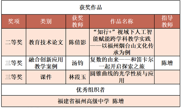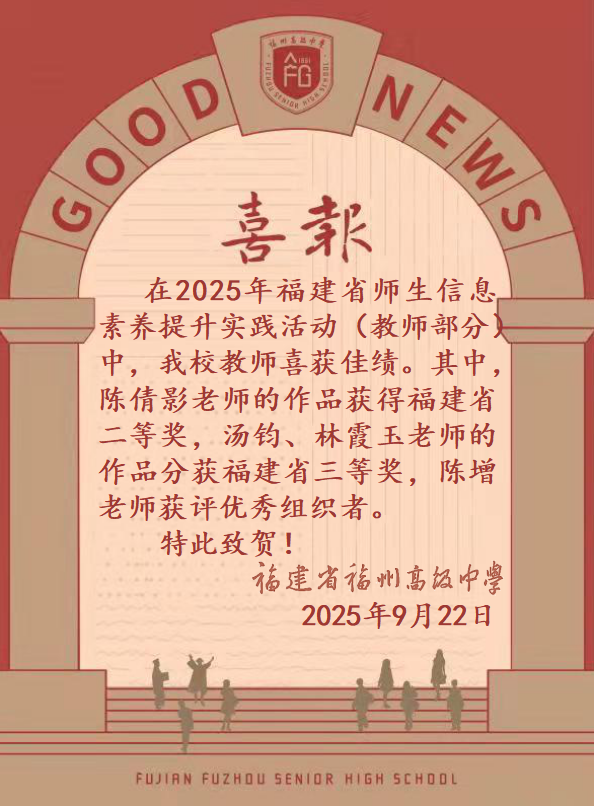 根據(jù)福建省電教館《關(guān)于公布福建省 2025 年師生信息素養(yǎng)提升實踐活動(基礎(chǔ)教育組教師部分)獲獎名單的通知》文件,我校教師喜獲佳績:陳倩影老師的作品獲得福建省二等獎,湯鈞、林霞玉老師的作品分獲福建省三等獎;陳增老師獲評優(yōu)秀組織者。特此致賀!